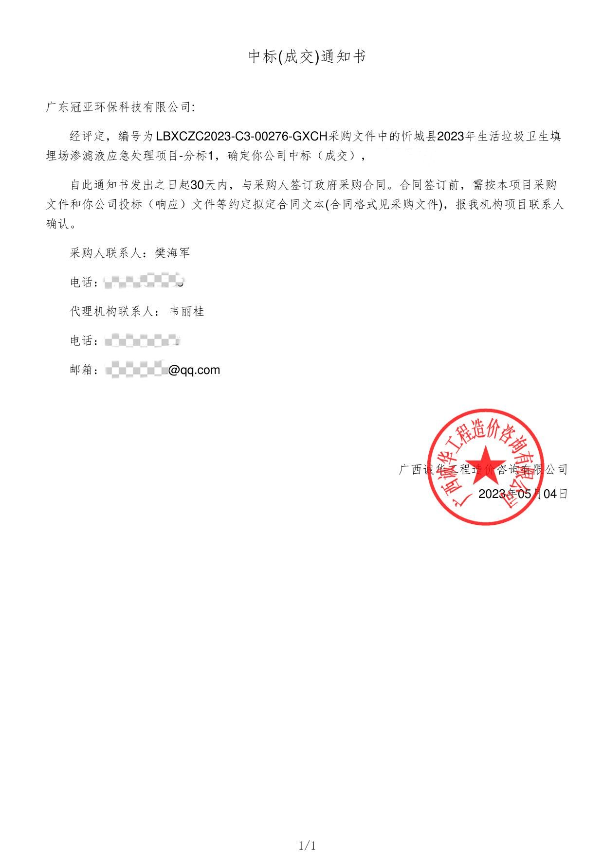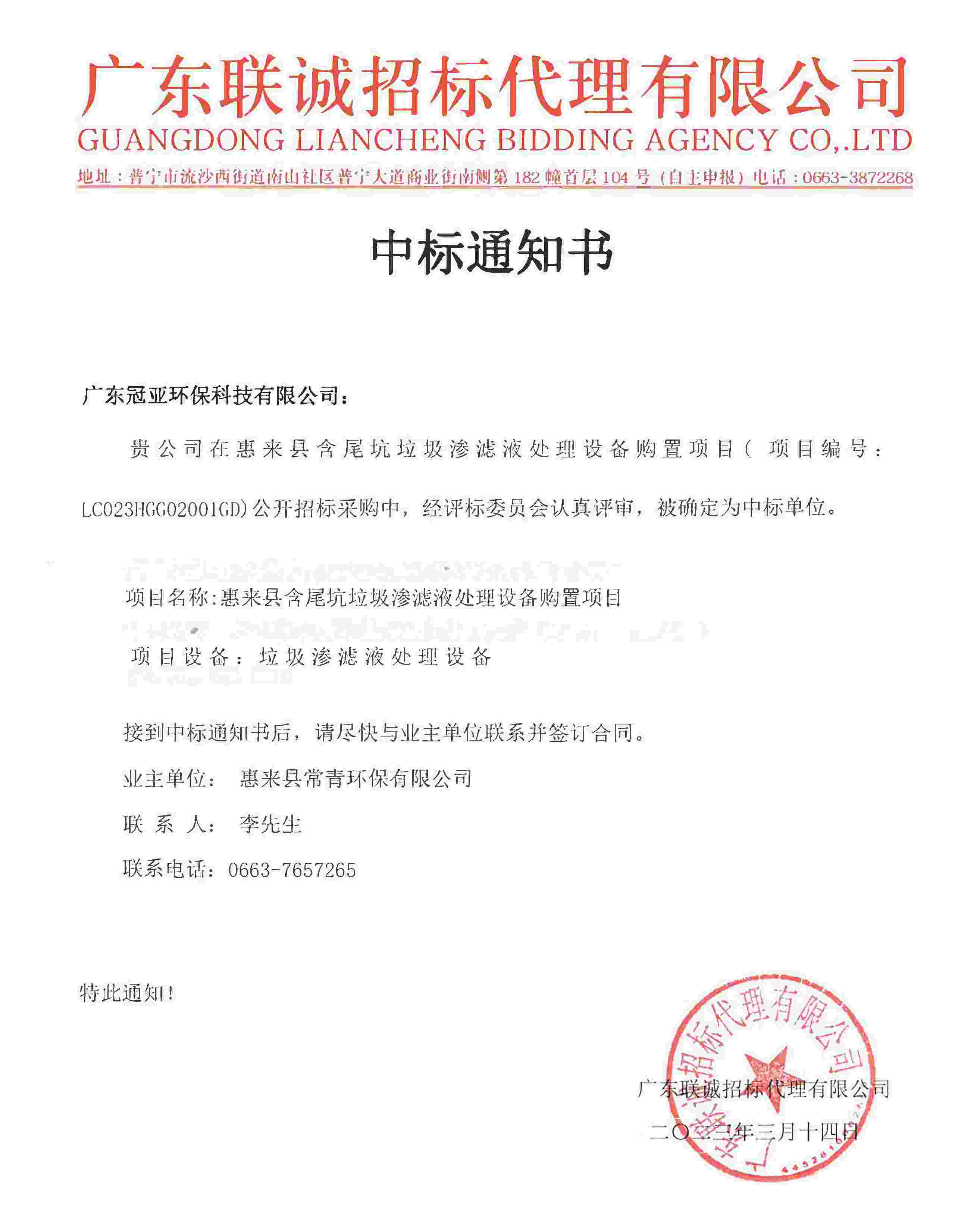 廣東惠來縣垃圾滲濾液處理設備中標通知 貴公司在惠來縣含尾坑垃圾滲濾液處理設備購置項目(項目編號:LC023HGG02001GD)公開招標采購中,經評標委員會認真評審,被確定為中標單位。 承接單位:廣東冠亞環保...